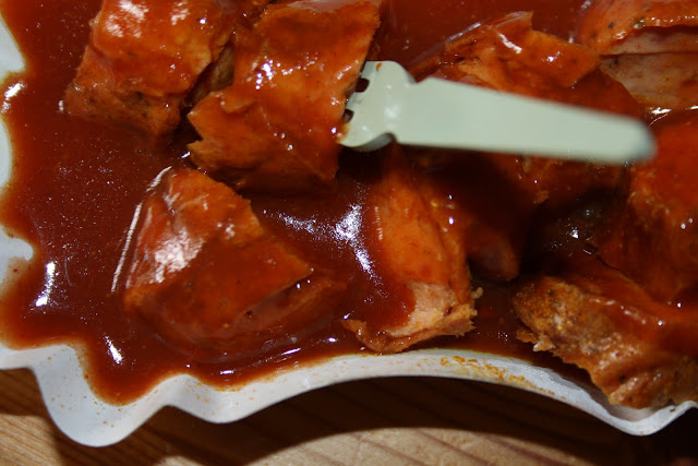 Salchicha, curry y ketchup por 1.50€. Eso es todo. Y teniendo en cuenta, que no soy muy amiga del curry, he de decir que está bastante buena, el ketchup con el curry tiene un toque dulce. Nunca antes la había probado,porque me daba la sensación de que el curry me iba a revolver el estómago. Pero hoy me apetecía probarla... será eso señal de que me estoy integrando en la vida berlinesa?? jaja